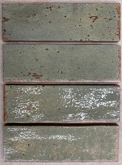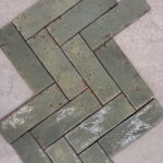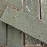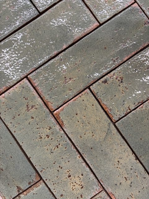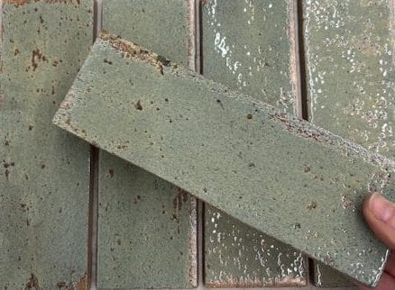 This gloss brick tile features rich sea green tones layered with subtle coppery undertones that shimmer in the light thanks to its high-gloss finish. The edges are slightly uneven giving the tile a hand made feel.